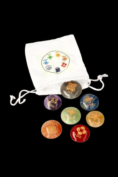 Zeven platte chakra stenen van 3 cm per stuk. Rode Jaspis, Oranje Aventurijn, Gele Aventurijn, Groene Aventurijn, Lapis Lazuli, Paarse Aventurijn, Amethist.