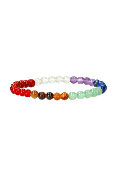 Met edelstenen worden veel chakra producten gemaakt. Maar waarom? De chakra’s zijn draaiende energie schijven waardoor energie van het etherische lichaam naar het fysieke lichaam stroomt. Via deze schijven of wielen, chakra betekent in het sanskriet wiel, wordt ons lichaam dus gevoed met de broodnodige energie. Die energie gaat rechtstreeks naar de klieren die aan de chakra’s gelieerd zijn. Die klieren maken vervolgens hormonen. Het is dus duidelijk dat de werking van de chakra’s voor een groot deel bepalen hoe wij ons voelen. Edelstenen zijn bij uitstek geschikt om deze chakra’s te voeden, ontwikkelen en zelfs te laten groeien. Dus voor een lekker uitgebalanceerd en energiek gevoel is het van belang aan de chakra’s te denken. Draag deze armband om de 7 hoofd chakra’s te voeden met energie en ze te helen.