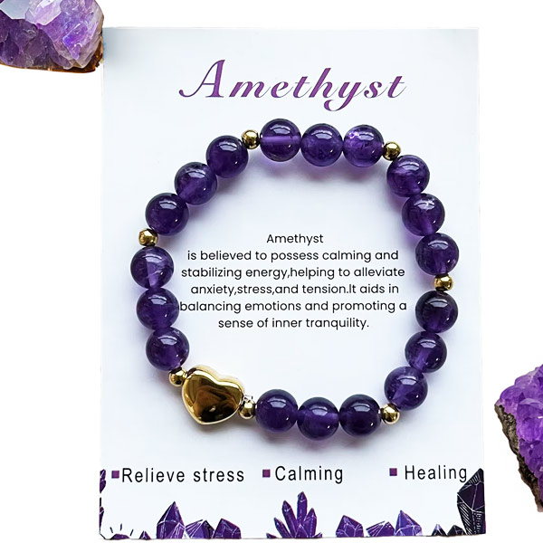 Het goudkleurige hartje staat voor liefde, warmte en bescherming. In combinatie met Amethist versterkt het de energie van compassie en zelfliefde. Het herinnert eraan dat rust niet alleen van buiten komt, maar ook uit het hart zelf.