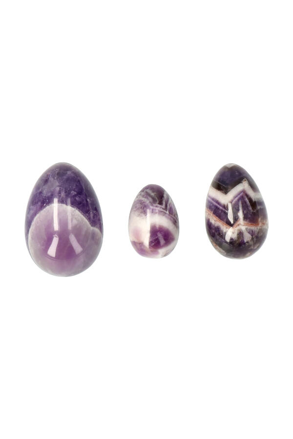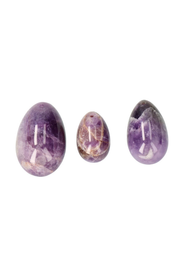 Set van drie Amethist Yoni eieren in formaten Large (45 mm x 30 mm), Medium (40 mm x 26 mm) en Small (31 mm x 20 mm). Keuze uit set met of zonder gaatjes voor een touwtje.