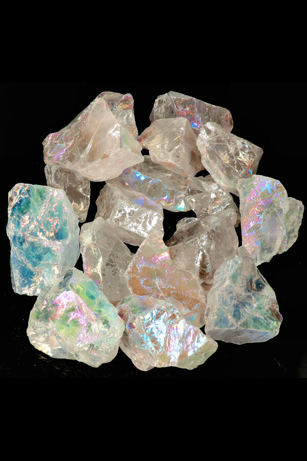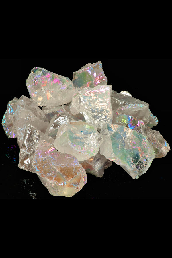 Angel Aura is niet geverfd. Het platinum en zilver worden over de bergkristal heen geneveld in een alchemisch proces zodat de stenen aan elkaar worden gebonden.