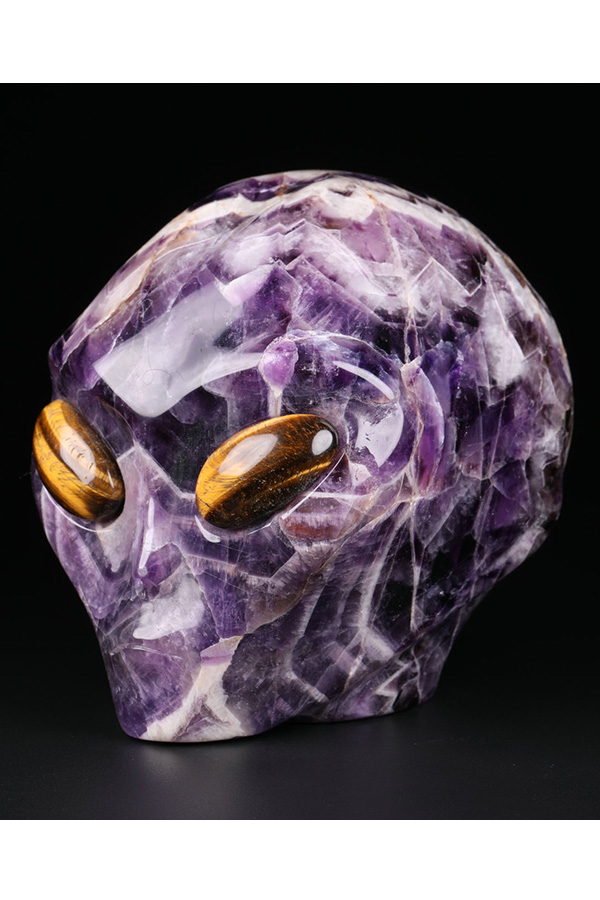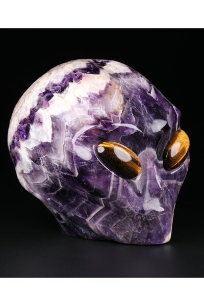 De combinatie van Chevron Amethist en Tijgeroog biedt een rijke synergie van spirituele, fysieke en emotionele voordelen. Wanneer deze stenen worden gecombineerd in de vorm van een Chevron Amethist alien met Tijgeroog ogen, ontstaat er een krachtige skull met een heerlijke energie.