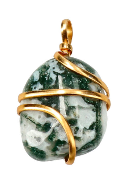 Mosagaat spiraal hanger verguld, trommelsteen, stenen ongeveer tussen de 1.5 en 2.5 cm.