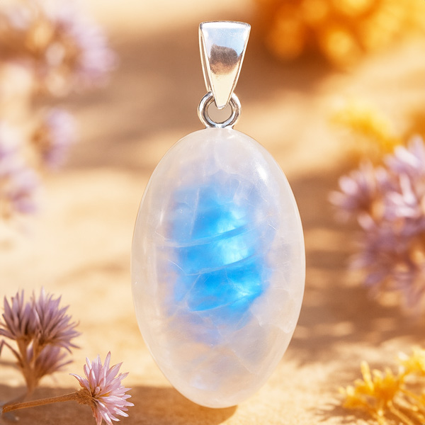 Zacht, licht en magisch… deze regenboog maansteen hanger straalt van binnenuit. Zodra het licht op de steen valt, verschijnt die herkenbare blauwe glans, alsof je een glimp opvangt van iets groters.