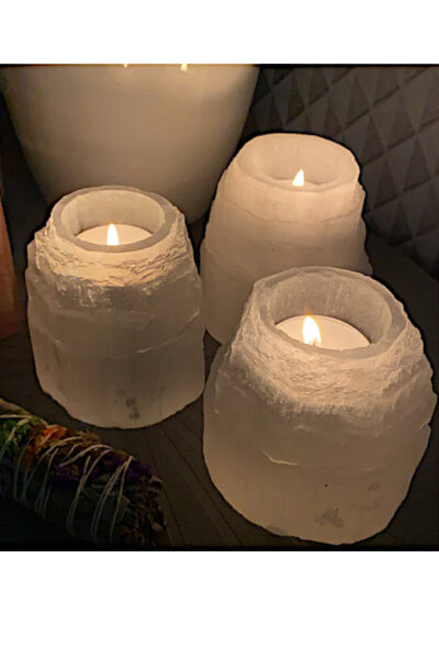 Seleniet waxinelicht houder ruw Everest , circa 8 cm.  Ruwe stenen dus er kunnen kleine inclusies van Zwarte Toermalijn of rode en groene Seleniet in zitten. Geeft de houder nog meer charme.