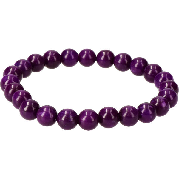 Sugiliet is een zeldzaam mineraal, dat wereldwijd slechts op enkele plaatsen in significante hoeveelheden voorkomt. De karakteristieke paarse kleur varieert van diep violet tot lichter lavendel, vaak met zwarte of grijs-witte insluitsels. Bij deze armband zijn de kralen van 8 mm diameter en heeft hij een lengte van circa 19 cm, passend voor de meeste polsen. De kralen zijn zorgvuldig geselecteerd op kleurkracht en kwaliteit, waardoor het een exemplaar is dat bij een liefhebber van edelstenen uitstekend past.