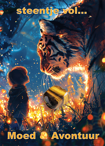 Perfect voor mensen die aan iets nieuws beginnen, een beetje zenuwachtig zijn voor wat komt of gewoon wel wat extra power kunnen gebruiken. De krachtige illustratie van een kind tegenover een vurige tijger zegt alles zonder woorden. En de steen doet de rest.
