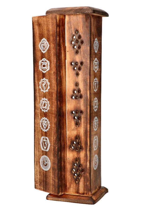 Wierook combi toren/kistje donkerbruin hout 7-Chakra, 30 cm. Te gebruiken als wierookbrander voor stokjes of kegels.