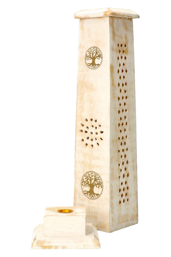 Wierook toren Whitewash hout Tree of Life, 30 cm. Te gebruiken als wierookbrander voor stokjes of kegels.