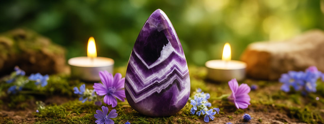 Chevron Amethist (Amethist kwarts) is in veel opzichten hetzelfde als zijn heldere familielid: Amethist. De kwarts in de steen versterkt de eigenschappen van de Amethist. De steen beschermt als alles even te snel gaat in je ontwikkeling (spiritueel, emotioneel of fysiek). Informatie en ervaringen worden op een rustige manier ons bewustzijn in begeleid. Het beschermt ons ook voor blootstelling aan datgene waar we nog niet rijp voor zijn. Zo voorkomt de kwarts paniek. Onder het kussen zorgt de steen voor een diepe rustige slaap. Voor mensen die veel energieën van anderen oppakken is de Amethist reuzehandig. Ze zorgt ervoor dat die energieën niet blijven hangen en ons trillingsniveau niet gaat meetrillen.